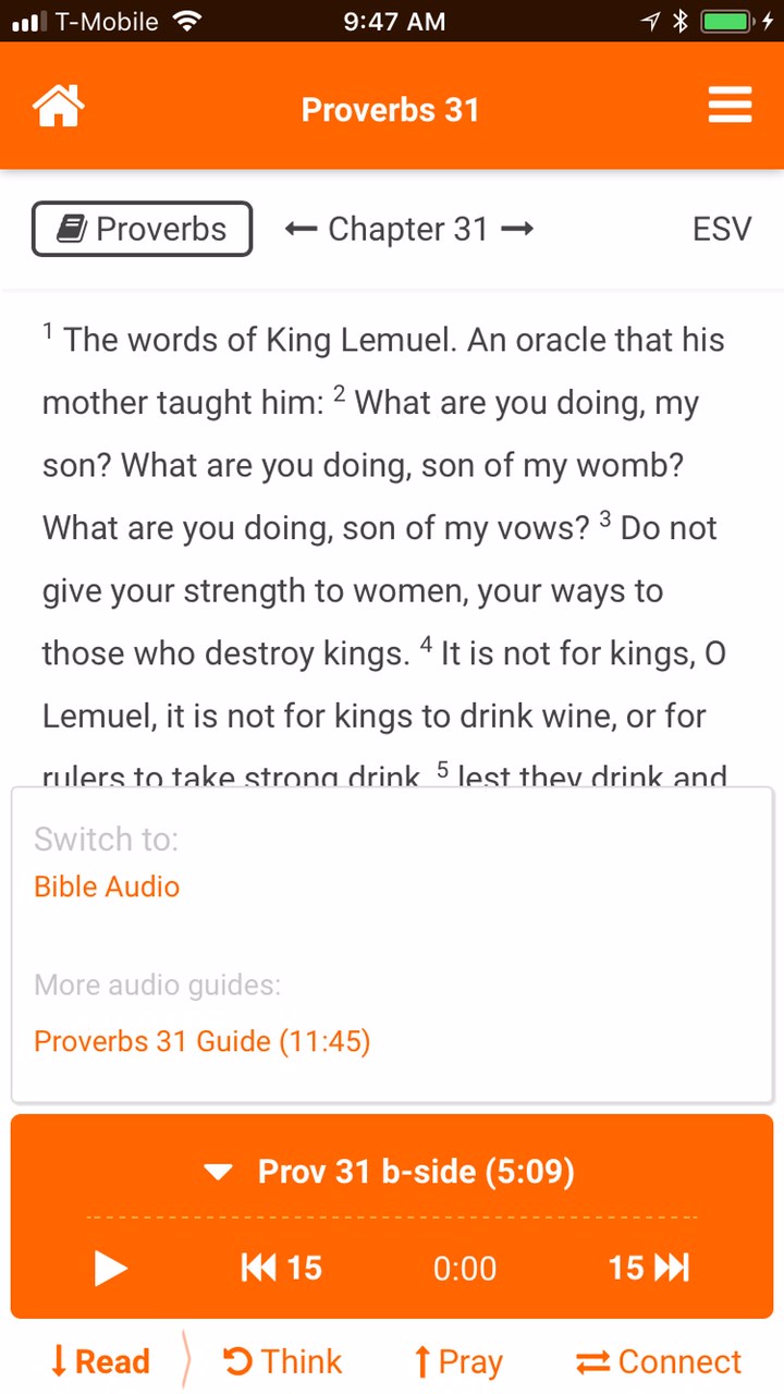 Of course the b-side is just optional – if you’ve got a little extra time and interest. If not, you won’t even see it. To find it, just tap on the little down arrow (triangle) next to the audio title to bring up more available audio, then tap on the b-side. Like I said – only the end of Proverbs is available now.